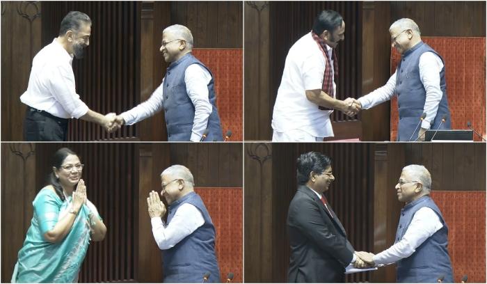 அவர்களுக்குப் பதில் புதிய உறுப்பினர்களாக 6 பேர் ஏற்கனவே போட்டியின்றி தேர்வாகினர். அவர்களில் மக்கள் நீதி மய்யம் தலைவர் கமல் ஹாசன் திமுகவைச் சேர்ந்த ராஜாத்தி(கவிஞர் சல்மா) எஸ்.ஆர். சிவலிங்கம் பி.வில்சன் ஆகிய 4 பேர் இன்று மாநிலங்களவை உறுப்பினர்களாக பதவியேற்றனர். இதையடுத்து அவர்கள் அனைவரும் அவையை நடத்தி வரும் துணைத் தலைவர் ஹரிவன்ஷிடம் வாழ்த்து பெற்றனர்.