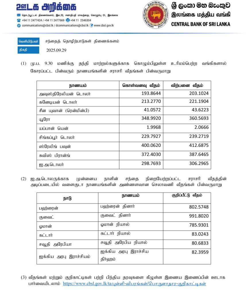 அதன்படி ஏனைய வெளிநாட்டு நாணய மாற்று விகிதங்கள் தொடர்பாக இன்று மத்திய வங்கியினால் வெளியிடப்பட்டுள்ள தகவல்கள் கீழே தரப்பட்டுள்ளது.