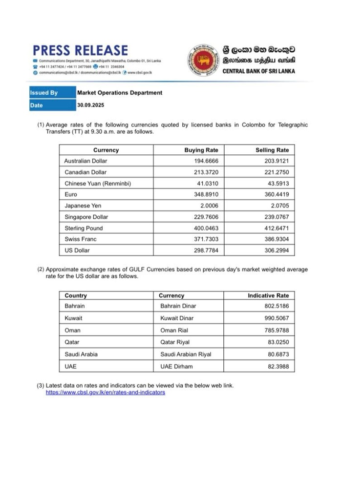 இலங்கை மத்திய வங்கி இன்றைய தினம் செவ்வாய்க்கிழமை வெளியிட்டுள்ள நாணய மாற்று விகிதத்தின் அடிப்படையில் அமெரிக்க டொலரின் விற்பனை விலை 306.2994 ரூபாவாகவும், கொள்வனவு விலை 298.7784 ரூபாவாகவும் பதிவாகியுள்ளது.