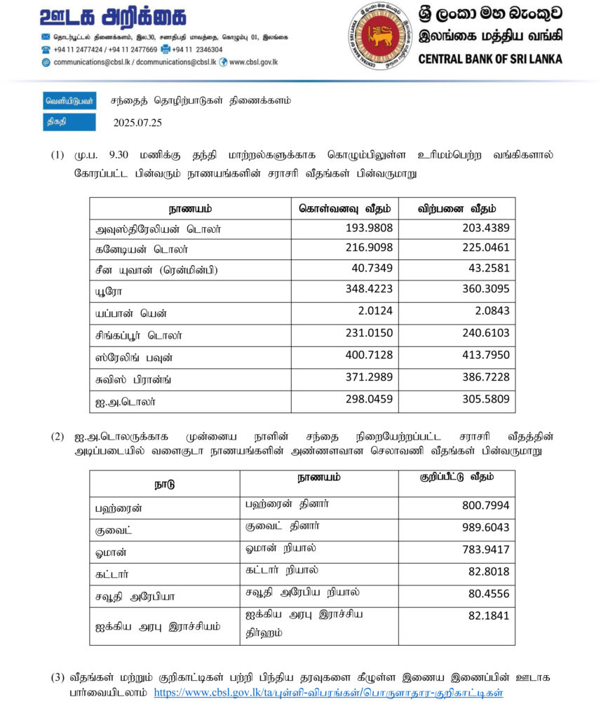 அதன்படி, ஏனைய வெளிநாட்டு நாணய மாற்று விகிதங்கள் தொடர்பாக இன்று (25.07.2025) மத்திய வங்கியினால் வெளியிடப்பட்டுள்ள தகவல்கள் கீழே தரப்பட்டுள்ளது.