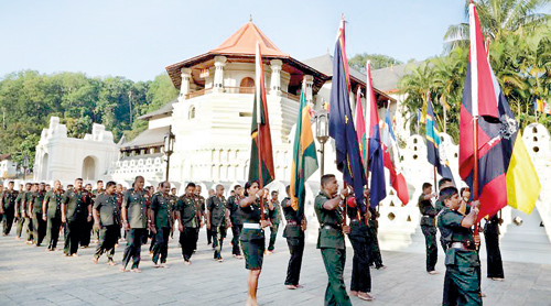 இலங்கை இராணுவத்தின் 76 ஆவது ஆண்டு நிறைவை நினைவுகூரும் வகையில் ஏற்பாடு செய்யப்பட்ட சிறப்பு மத நிகழ்ச்சிகளின் ஒரு பகுதியாக இராணுவக் கொடிகளுக்கு ஸ்ரீ தலதா மாளிகையில் ஆசீர்வாதம் பெறும் விழா கண்டியில் உள்ள ஸ்ரீ தலதா மாளிகை வளாகத்தில் நேற்று ஞாயிற்றுக்கிழமை நடைபெற்றது.