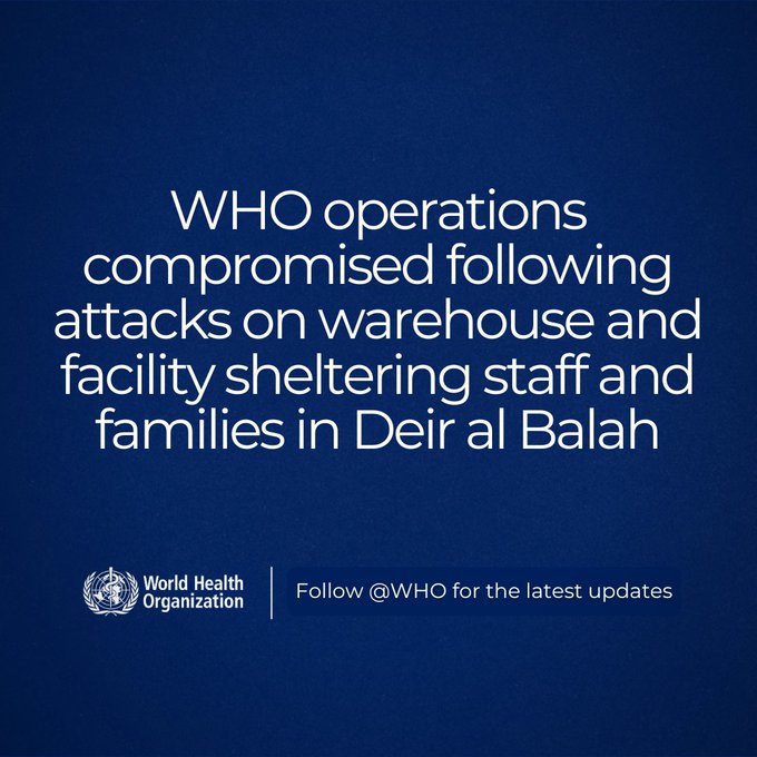 இஸ்ரேலிய இராணுவத்தால் வெளியிடப்பட்ட சமீபத்திய வெளியேற்ற உத்தரவுக்குப் பிறகு டெய்ர் அல் பலாவில் அதிகரித்த மோதலை தொடர்ந்து உலக சுகாதார ஸ்தாபன ஊழியர்களின் வீடு மூன்று முறை தாக்கப்பட்டது. வான்வழித் தாக்குதல்கள் தீ மற்றும் குறிப்பிடத்தக்க சேதத்தை ஏற்படுத்தியதால் குழந்தைகள் உட்பட ஊழியர்கள் மற்றும் அவர்களது குடும்பங்கள் கடுமையான ஆபத்தில் இருந்தனர் மற்றும் அதிர்ச்சியடைந்தனர்.