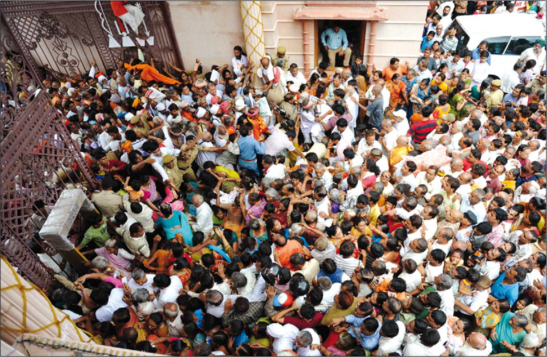 கோயிலுக்கு செல்லும் படிக்கட்டுகளில் மின்சாரம் தாக்கிதயதாக தகவல் பரவியதையடுத்து பக்தர்கள் அங்கிருந்து இறங்கிச் செல்ல முயற்சித்துள்ளனர். நூற்றுக்கணக்கான பக்தர்கள் ஒரே நேரத்தில் ஓட முயற்சித்ததால் அங்கு கடுமையான கூட்ட நெரிசல் ஏற்பட்டுள்ளது. இதில் சிக்கி ஆறு பேர் சம்பவ இடத்திலேயே உயிரிழந்துள்ளனர். மேலும் 30-க்கும் மேற்பட்டோர் படுகாயம் அடைந்துள்ளனர்.