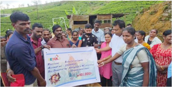சூறாவளி நாட்டைத் தாக்கி நேற்றுடன் ஒரு மாதம் நிறைவடைந்த நிலையில் தோட்டத் தொழிலாளர்கள் மற்றும் அந்தப் பகுதிக்கு வெளியே பணிபுரியும் இளைஞர்களால் சேகரிக்கப்பட்ட ரூ.108,000 அரசாங்கத்தின் பேரிடர் நிதிக்கு நன்கொடையாக வழங்கப்பட்டது.