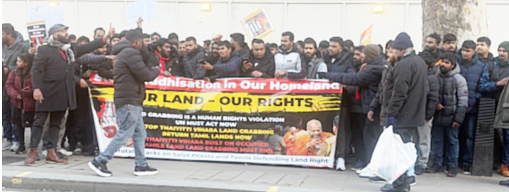 யாழ்ப்பாணம் தையிட்டியில் சட்டவிரோதமாக அமைக்கப்பட்ட விகாரைக்கு எதிராக மக்களால் முன்னெடுக்கப்படும் தொடர் போராட்டத்தில் கடந்த மார்கழி 21 ஆம் திகதி அன்று மதகுரு வேலன் சுவாமி உட்பட 5 தமிழர்கள் பொலிஸாரால் காட்டுமிராண்டித் தனமாக தாக்கப்பட்டு கைது செய்யப்பட்டதனை கண்டித்தும், தையிட்டியில் சட்டவிரோதமாக அமைக்கப்பட்ட விகாரையை அகற்றக் கோரியும் சனிக்கிழமை லண்டன் டோவ்னிங் பகுதியில் குறித்த கண்டன ஆர்ப்பாட்டம் இடம்பெற்றது. குறித்த ஆர்ப்பாட்டத்தில் பெருமளவான புலம்பெயர் உறவுகள் கலந்துகொண்டனர்.