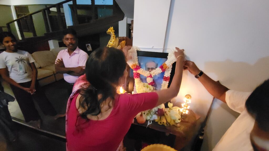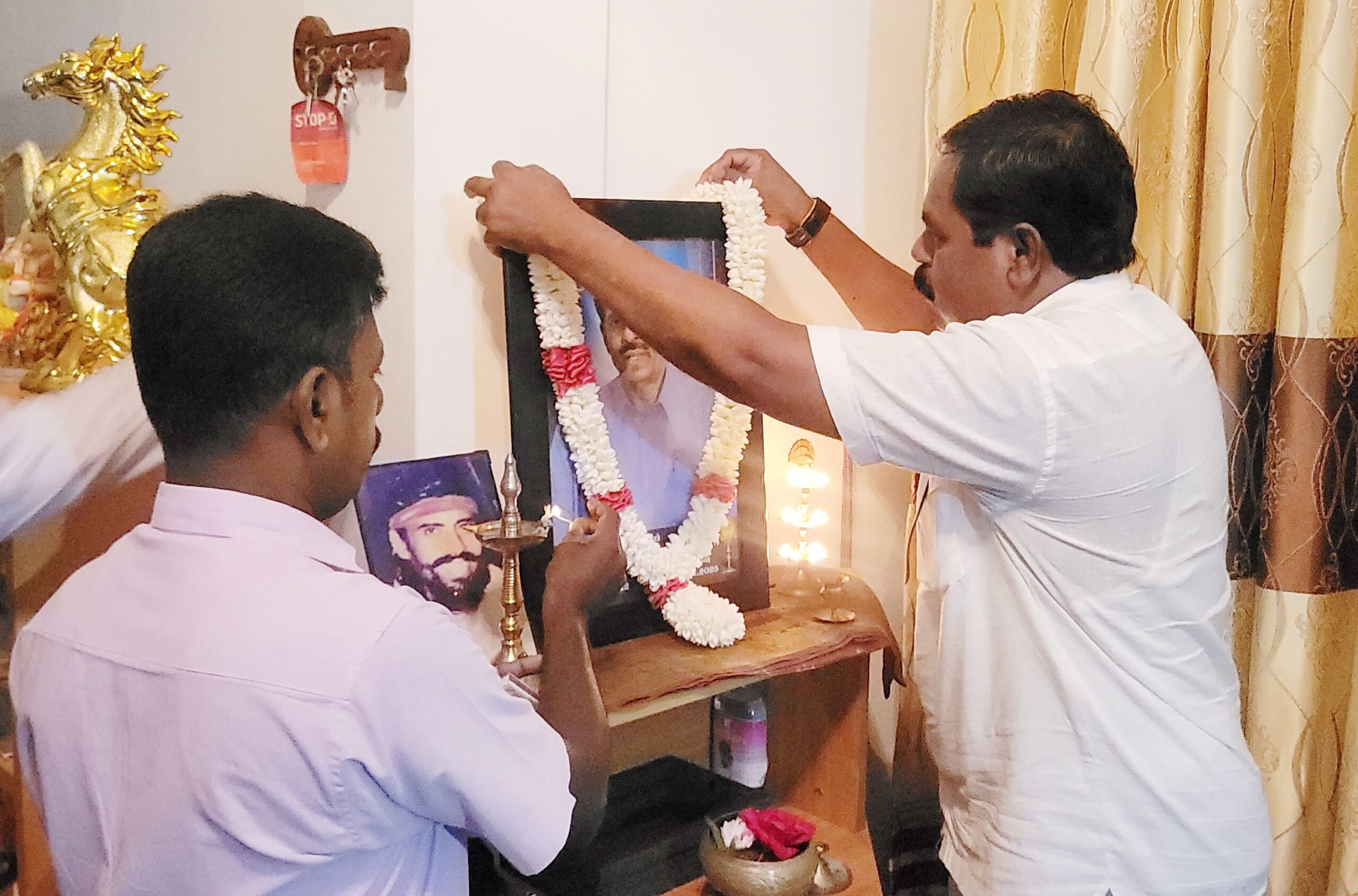 மாவிட்டபுரத்தில் உள்ள அவரது இல்லத்தில் நடைபெற்ற நினைவேந்தலில் மறைந்த மாவை சேனாதிராஜாவின் உருவப்படத்துக்கு மலர் மாலை அணிவித்து சுடரேற்றி அஞ்சலி செலுத்தப்பட்டது.