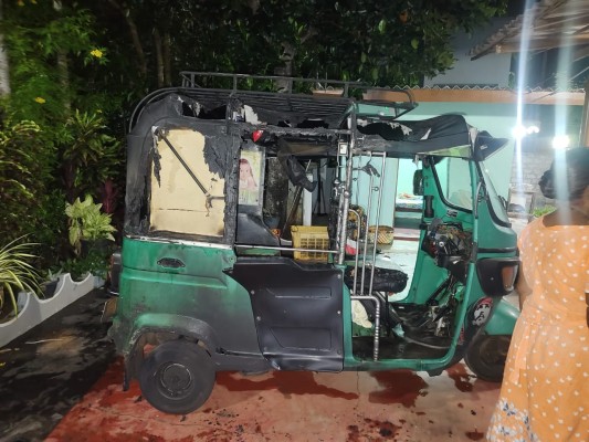 மோட்டார் சைக்கிளில் வந்த குழு, வீட்டின் முன் நிறுத்தப்பட்டிருந்த முச்சக்கரவண்டிக்கு மண்ணெண்ணெய் ஊற்றி தீ வைத்துள்ளனர்.