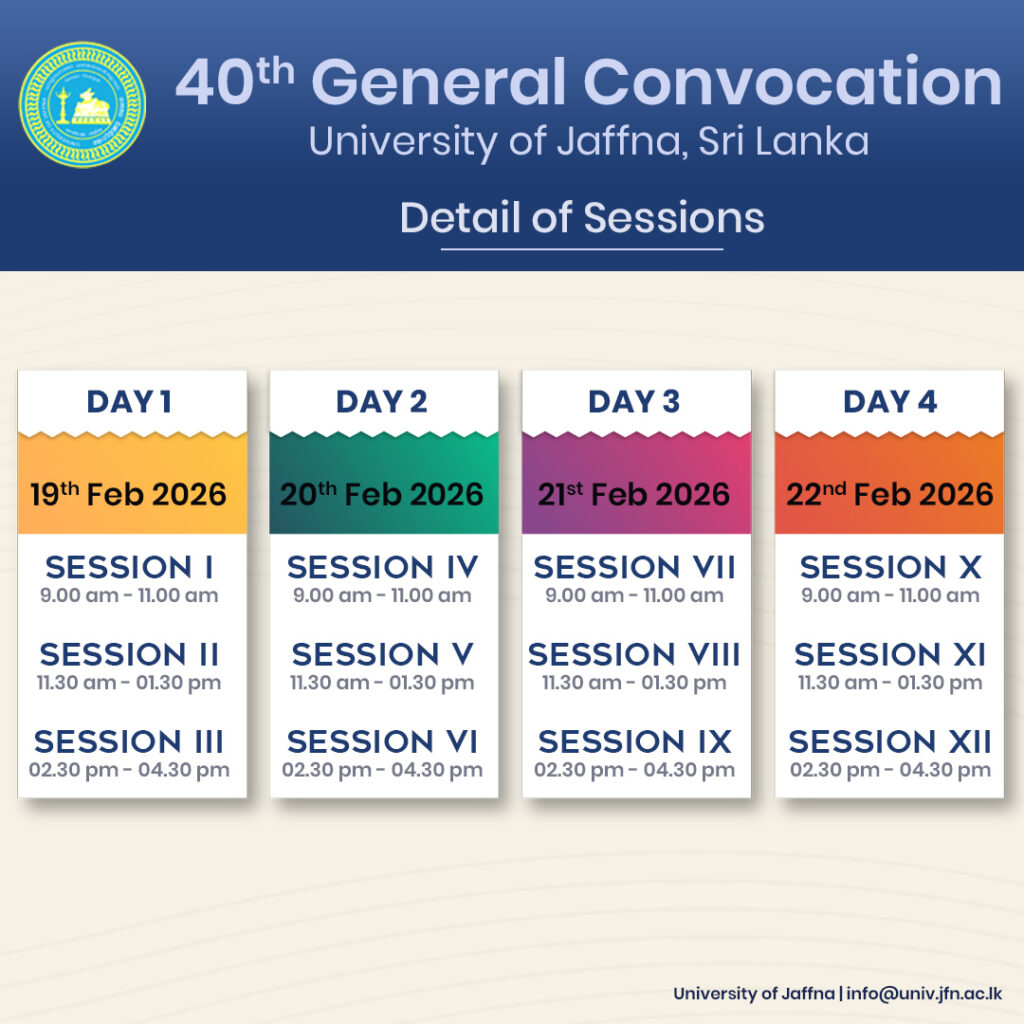 யாழ்ப்பாணப் பல்கலைக்கழகத்தின் 40 ஆவது பொதுப் பட்டமளிப்பு விழா நாளை வியாழக்கிழமை முதல் எதிர்வரும் 22 ஆம் திகதி ஞாயிற்றுக்கிழமை வரை நான்கு தினங்கள் வேந்தர் தலைமையில் உள்ளக விளையாட்டரங்கில் நடைபெறவுள்ளது.