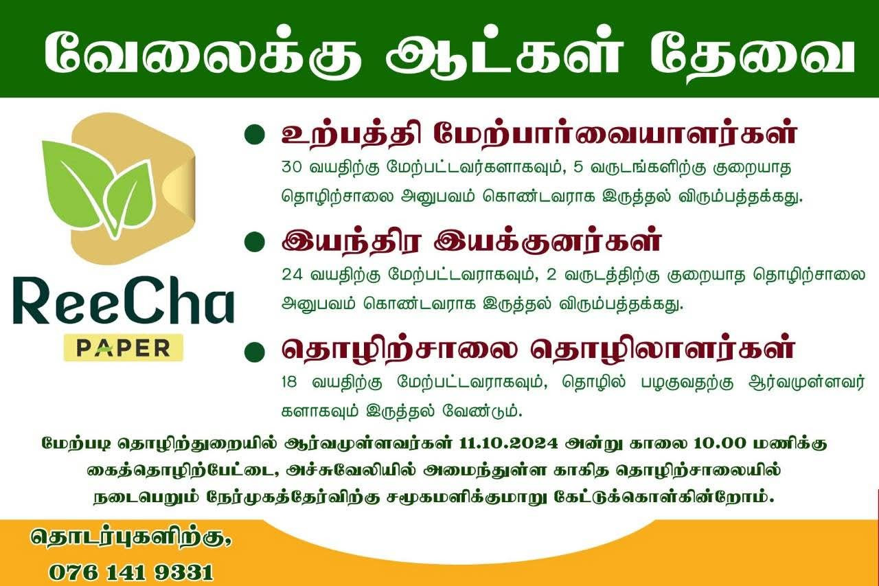 மேற்படி தொழிற்துறையில் ஆர்வமுள்ளவர்கள் 11.10.2024 அன்று காலை 10 மணிக்கு கைத்தொழிற்பேட்டை, அச்சுவேலியில் அமைந்துள்ள காகிதத் தொழிற்சாலையில் நடைபெறும் நேர்முகத்தேர்வில் கலந்துக்கொள்ளுங்கள்.