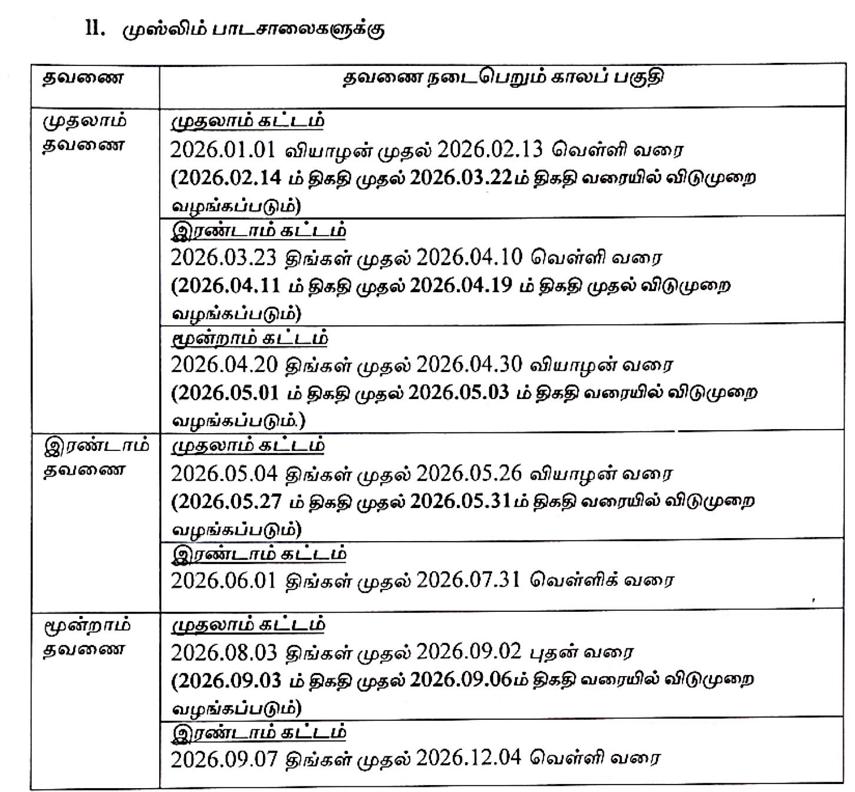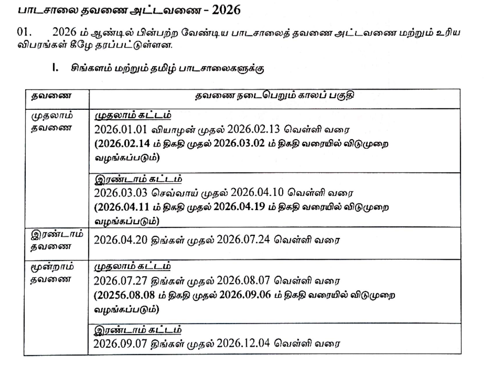 அரச மற்றும் அரச அங்கீகாரம் பெற்ற தனியார் பாடசாலைகளை உள்ளடக்கிய வகையில் 2026 ஆம் ஆண்டிற்கான பாடசாலை கால அட்டவணை கல்வி அமைச்சினால் வெளியிடப்பட்டுள்ளது.